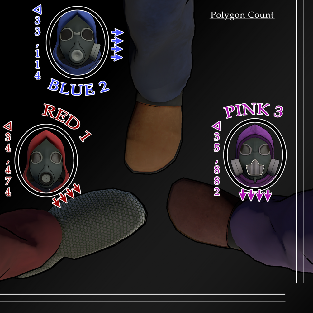 Included in this product there are three avatars. Red 1, Blue 2, and Pink 3 inspired from the Tokyo Ghoul. Each are slightly different than the other but are similar as they are supposed to be a trio. Includes Quest Prefabs.